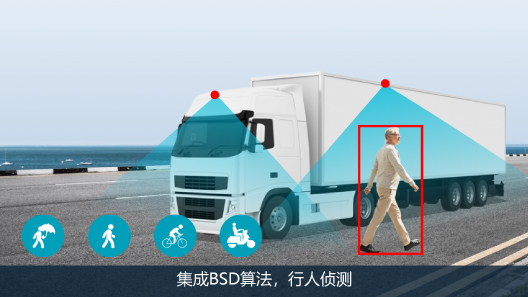 3)BSD:集成BSD算法,搭配高清摄像头可实时智能检测车辆侧前方、侧方和后方的行人,避免因视觉盲区造成的意外事故; 4)360:通过使用全景拼接技术,利用动态分析、矫正和拼接,满足车辆360°环视需求,为车辆提供安全保障。